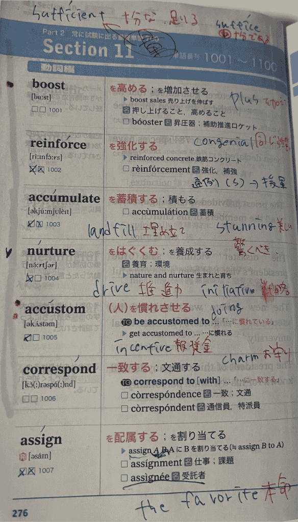 ターゲットは毎日必ず見出し語を500単語以上は復習していましたが、その時に書き込んだ単語も一緒に必ず周回していました。