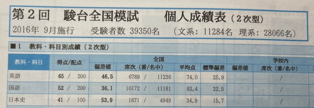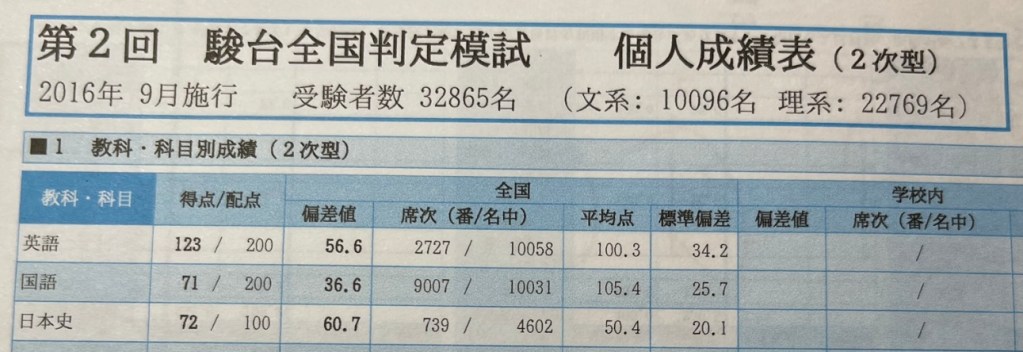 一方日本史は少し伸びました。前回は40点中20点分は勘で当てていたので、偏差値は45ほどありましたが、今回は勉強したので正しい結果が出たと思います。