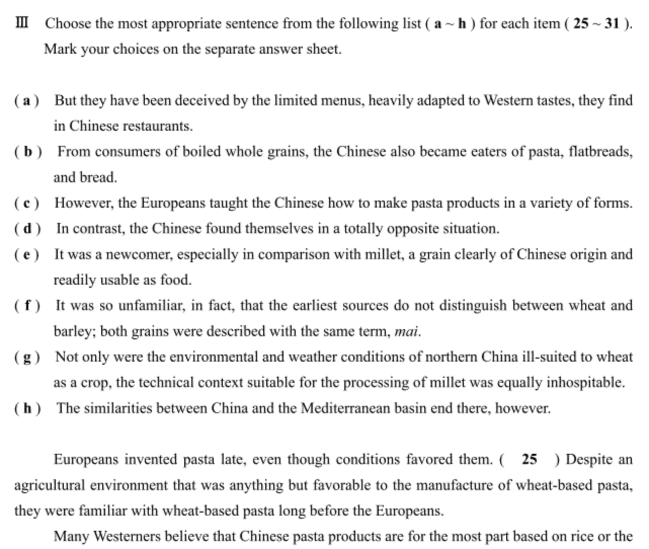 これは2020年の早稲田の文構の第3問です。これは(a)から(h)までの8個の選択肢を文中の7つの空欄に入れる問題です。解くコツがあり、苦手な人はかなり苦手です。