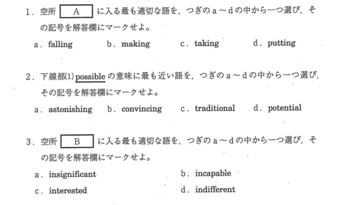 こういった空欄問題や下線部問題、類推問題などは選択肢まで読みません。読み落とさないからです。空欄などが出てきた時に解けばいいだけです。