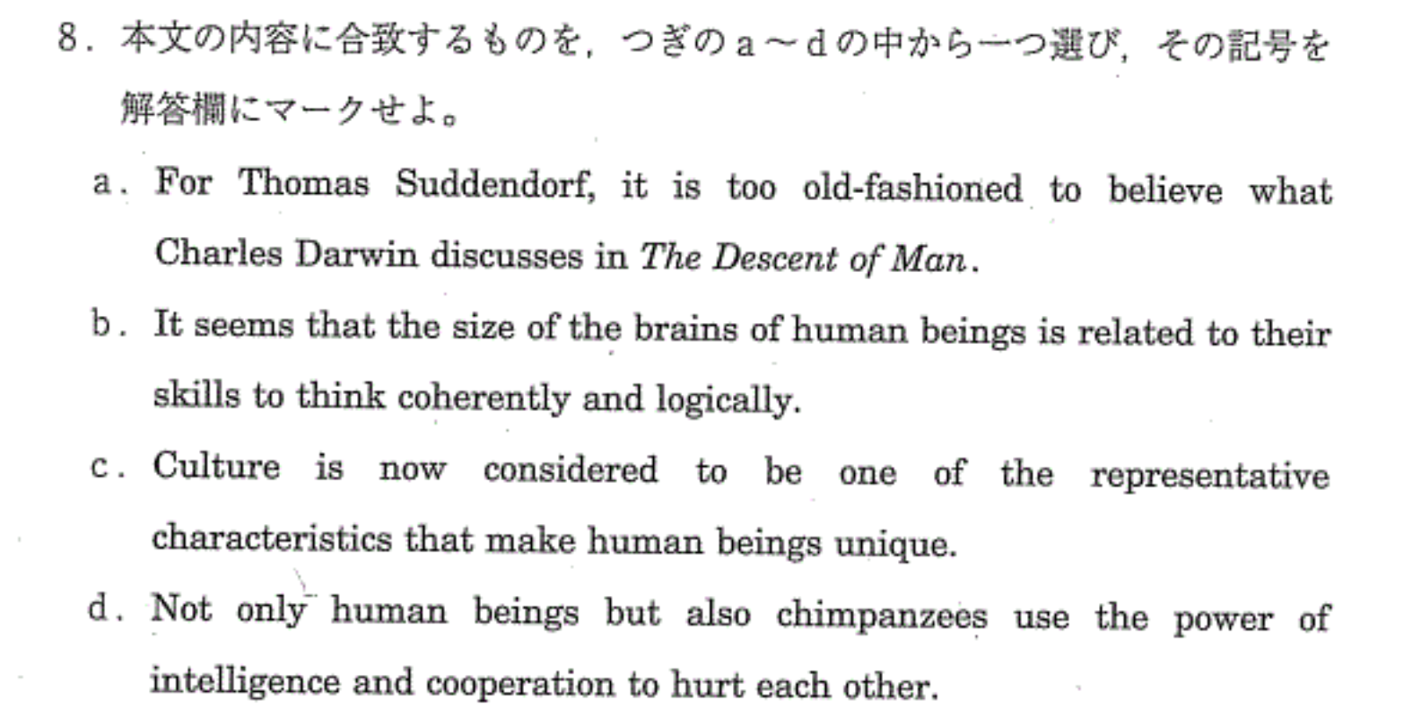 選択肢bなら、「the size of the brains of human beings」をキーワードにします。人間の脳の大きさの話はどこか一つの段落でしかしなぞうですよね。そういった感覚も徐々に養っていくべきです。
