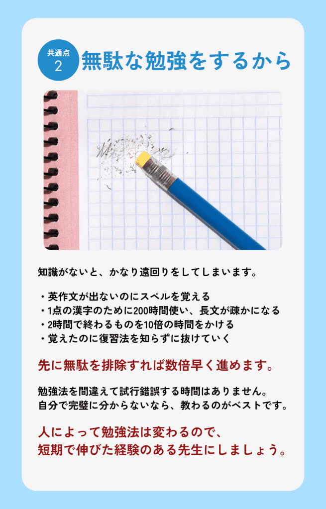 ありません。人それぞれやるべきことが違うので、それぞれ別々のことをやってもらっています。夏期講習は塾側が追加で費用をもらうためにやっているものなので、必要不可欠ではないと思います。