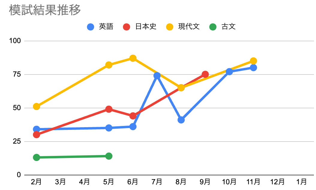 古文と日本史はあまり解いていませんが、このような伸びになりました。英語は事故って一度挫折しましたが、今では共通でも安定してきました。