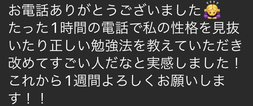 これは今では教え子になりましたが、初めて電話して体験をした時に言ってくれた言葉です。性格を見抜き、そのパターンに適した指導を心がけています。