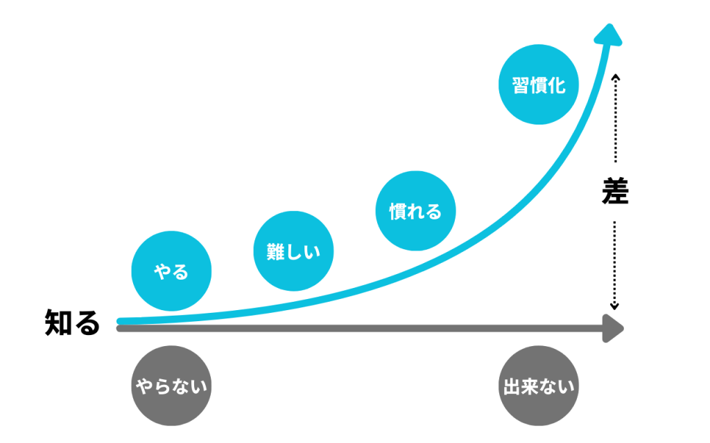 知識を手に入れてもやってみないと始まりません。やるうちにその難しさに気づき、修正や改善を繰り返していくことで慣れていき、習慣化します。