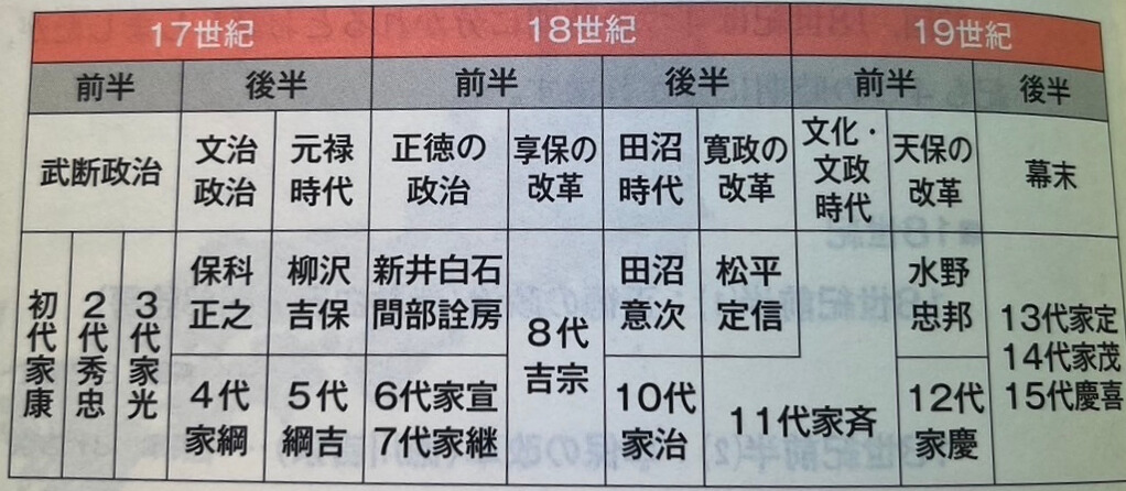 また、日本史の江戸時代の各年代の特徴と、将軍、将軍の次の権力者が分からない時はこういった表を見ます。通史を読んでいてもこの大局的な流れを意識できないので、こういった表で整理します。