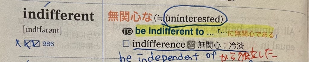 大体何でも勉強はパターン化できます。例えば英熟語が似ていて覚えにくい時はこうやって暗記します。「be indifferent to」と「be independent of」を長文で間違えた時にこうやって単語帳に書いて毎回暗記していきました。