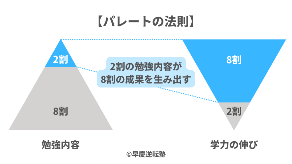 勉強の中には、伸びる勉強と伸びない勉強があります。効率のいいものとそうじゃないものはありますよね。この図は、伸びる勉強が2割あり、それは成果の8割に影響を及ぼすということです。