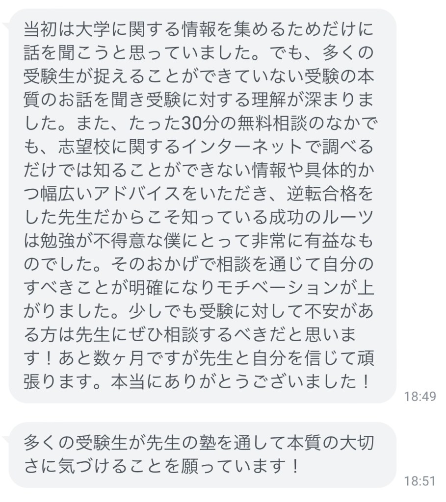 どっちの常識を信じるかで、受験の伸びが決まります。怖いからといって安心できるみんなと同じ道を進めば、伸びても偏差とは10程度でしょう。私の道は1年で偏差値が35も伸びた道です。今教えているものは受験期より効率がいいのでもっと伸びる人も出て来るでしょう。