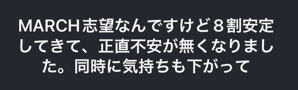 一番高い所を基準にすれば、それより下は簡単に感じます。早稲田の一番上の学部を目指してたので、早稲田の中堅学部は簡単でしたし、マーチは余裕でした。