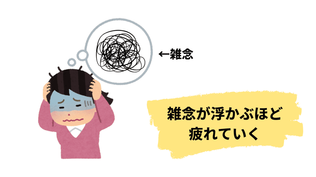 メンタルが弱っていると、こういった症状が表れます。とても疲れやすくなります。それはネガティブな感情が渦巻いているからです。それは、雑念が無限に湧いているのです。