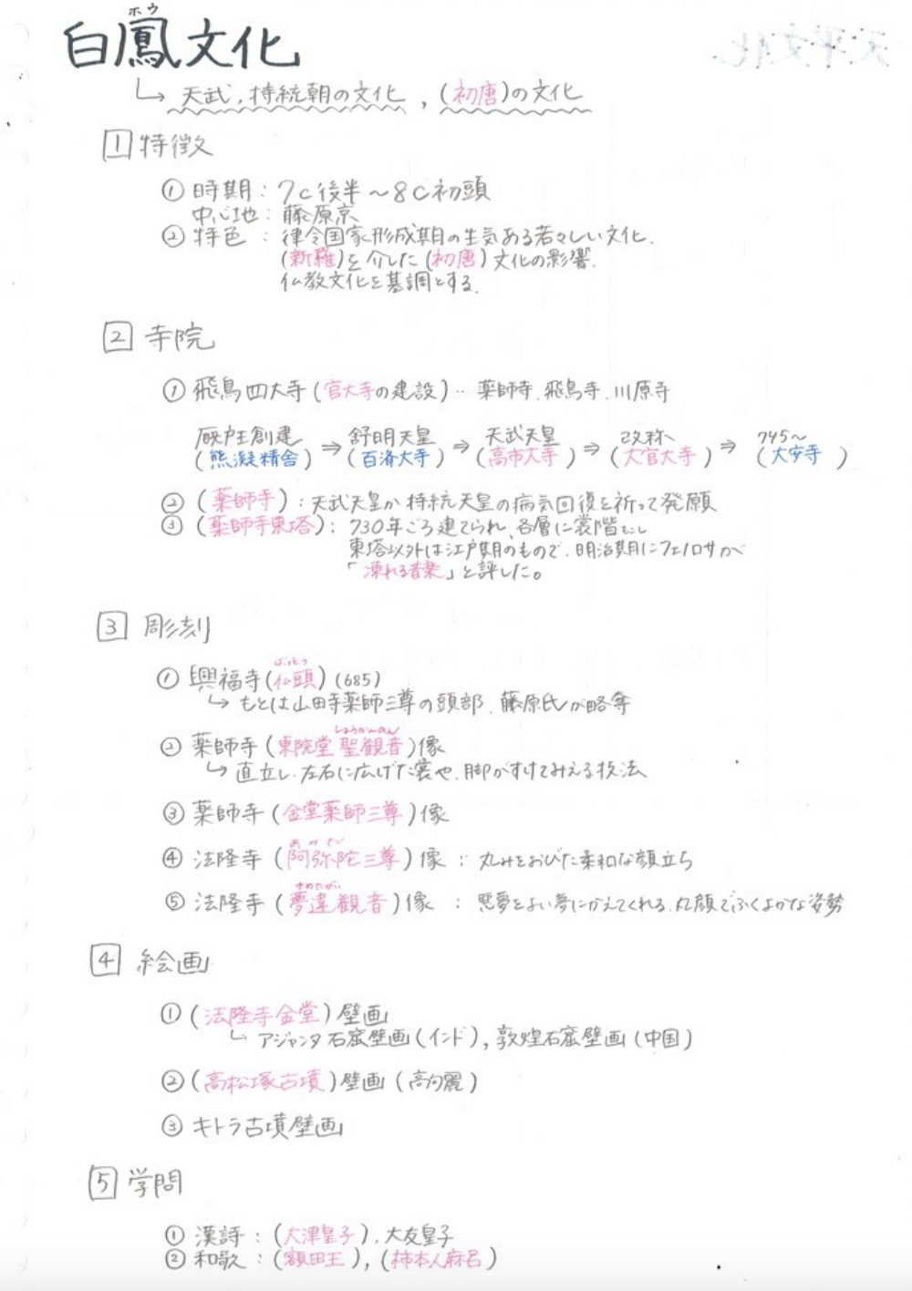 私ならこれを印刷し、赤シートで隠して答えられるようにし、何も見ずにアウトプットもできるようにします。「白鵬文化の彫刻は、6つで興福寺仏頭と〜…」といった風に何も見ずに言えるようにします。