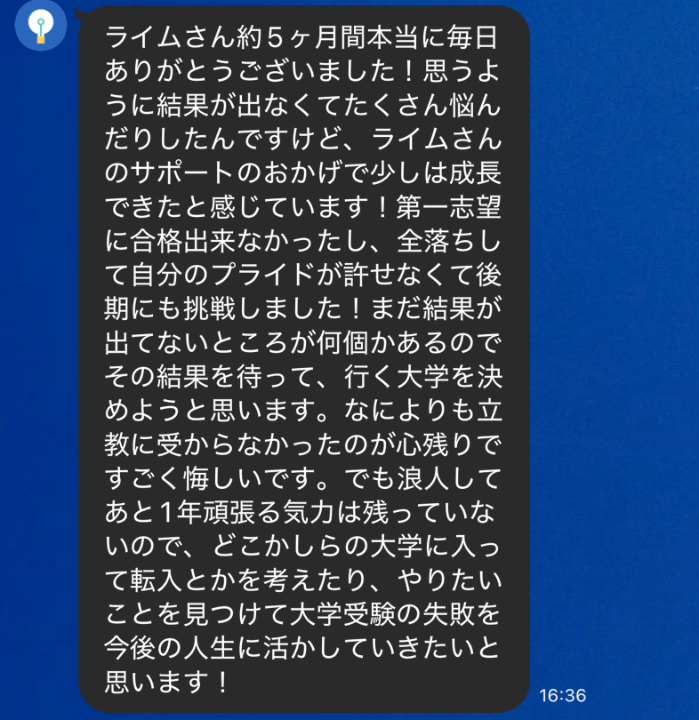 それでも毎日10時間ほど勉強を続けましたが、結局のびた実感がなく本番を迎えるのです。そして入試に臨み、全落ちしてしまいました。そこでこんなメンセージが届きました。