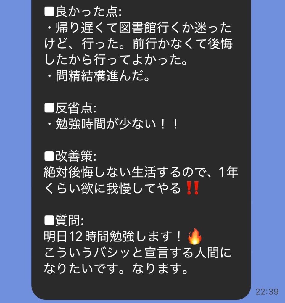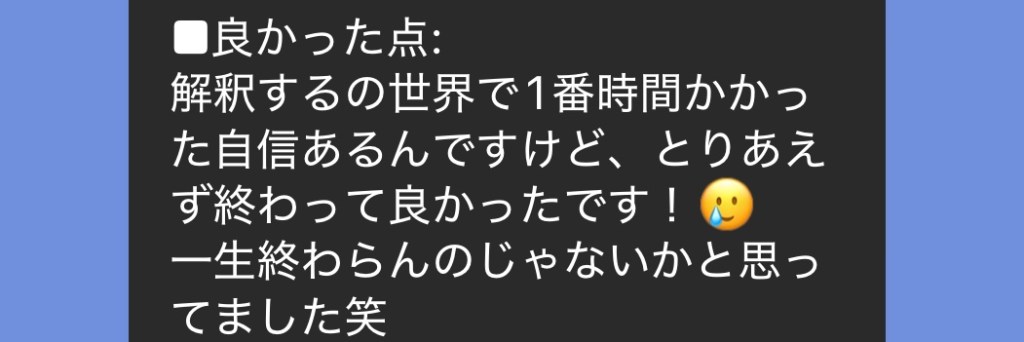 その日はかなり落ち込みましたが次の日に冷静に分析し、私に画像を送って解き方を聞きまくり、どんどん修正していきました。