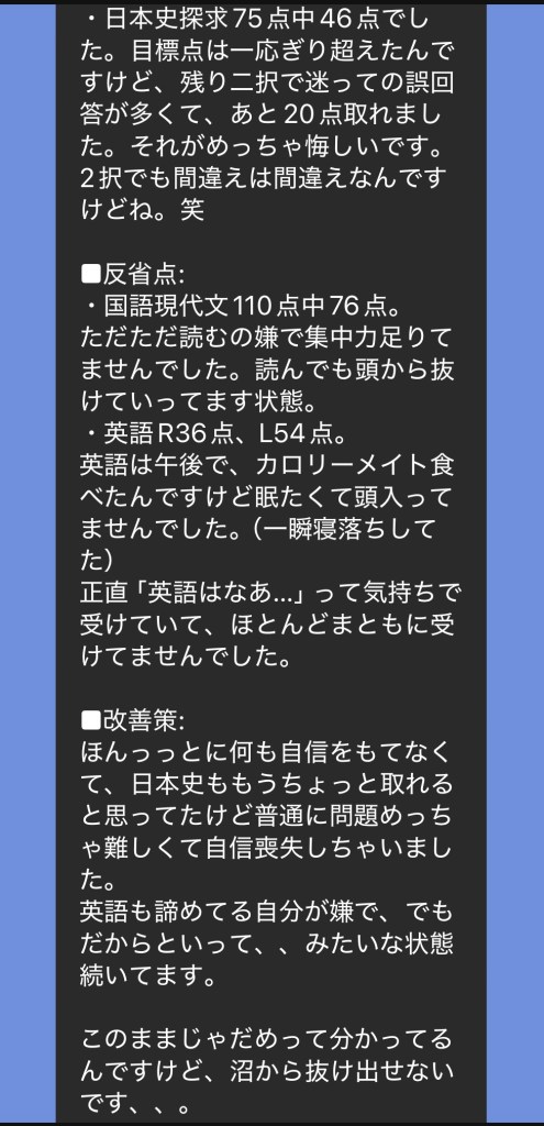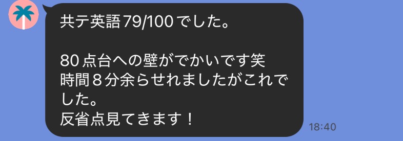 私の勉強法はほとんど教えきっていたのでそれを続け、共テ本番ではここまで伸びました。1年前に共テ英語20点だったのに、本番では9割まで上がりました。とても嬉しかったのを覚えています。