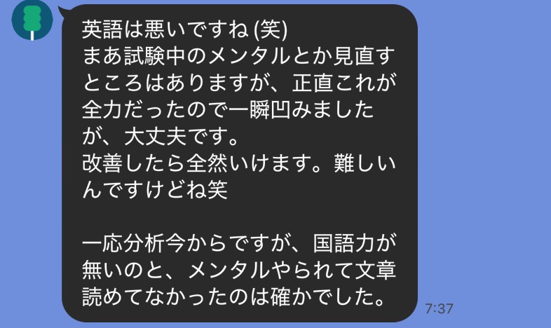 ですが解釈が終わっても共テ英語が38点だったので不安になることが多く、よく電話で考え方を教えました。これだけ悩んでいる人が受かっていると、やる気が出ますよね。