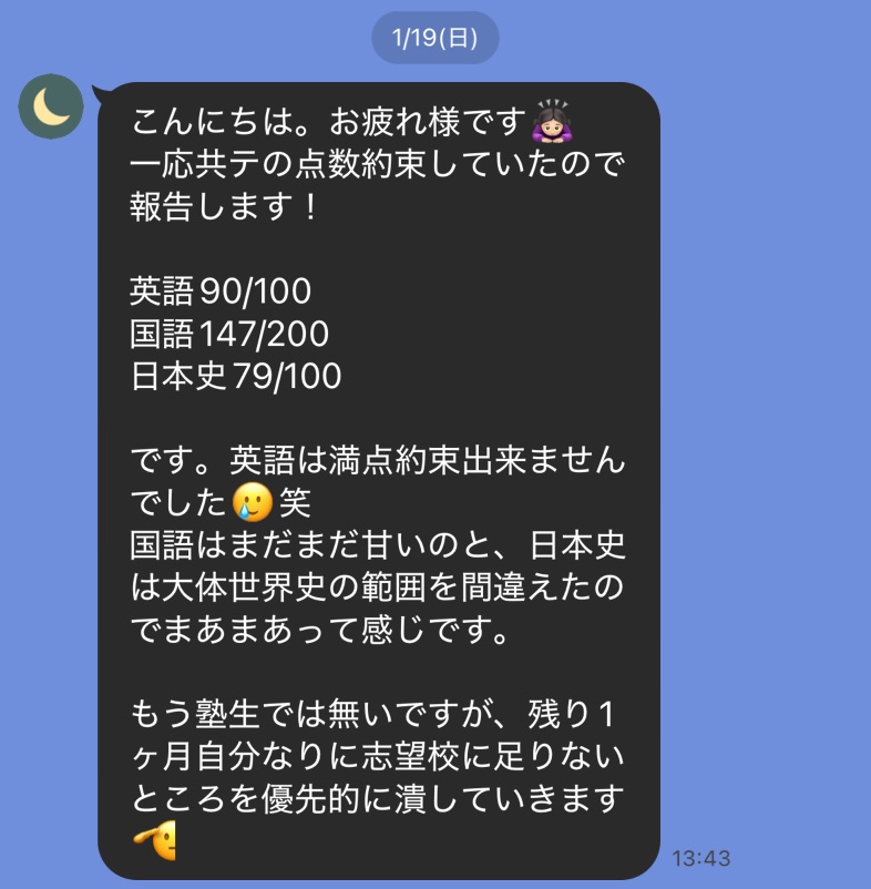 そして彼女は共テ模試で結果を出し自信をつけるために共テの予想問題を解きまくりました。ただ解くのではなく、毎回課題を見つけ、私と勉強法を確認しながら解いたのです。その結果…