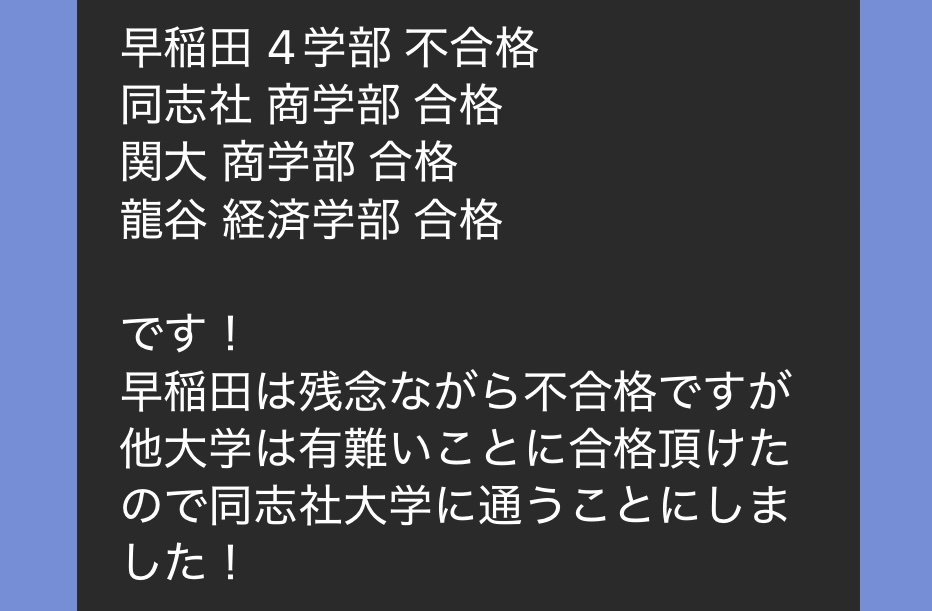 早稲田は落ちてしまったのですが、私と出会う前の志望校である同志社には合格できたようです。とても嬉しかったのですが、正直悔しかったです。