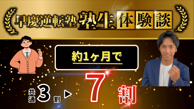 CATEGORY 逆転合格エピソード 【逆転エピソード】共テ2割から同志社に逆転合格した教え子の話 2025.11.05 逆転合格エピソード 川田来夢 早慶逆転塾 【エピソード】逆転合格したの共通点とストーリー4選 2025.09.04 逆転合格エピソード 川田来夢 早慶逆転塾 【逆転エピソード】進研偏差値40台から10ヶ月でマーチに逆転合格した話 2025.04.24 逆転合格エピソード 川田来夢 早慶逆転塾 【逆転エピソード】高3の9月から立教に逆転合格した子の話 2025.04.12 逆転合格エピソード 川田来夢 早慶逆転塾 2ヶ月で日東駒専に逆絵合格した友達の参考書や勉強内容について 2024.12.10 逆転合格エピソード 川田来夢 早慶逆転塾 【漫画】クラスに全国一位の友達がいた話 2024.09.10 モチベアップ 川田来夢 早慶逆転塾 【逆転エピソード】1ヶ月で共通英語3割から7割に上がった理由とは 2024.08.16 逆転合格エピソード 川田来夢 早慶逆転塾 【逆転合格エピソード】高3秋に共通5割から早稲田に逆転合格した理由とは? 2024.07.03 逆転合格エピソード 川田来夢 早慶逆転塾 【逆転エピソード】5ヶ月で共通英語が2割から8割まで上がったコツとは 2024.06.25 逆転合格エピソード 川田来夢 早慶逆転塾 【逆転合格エピソード②】高3の7月からMARCHに逆転した子の勉強法と推移について 2024.06.13 逆転合格エピソード 川田来夢 早慶逆転塾 もっと見る